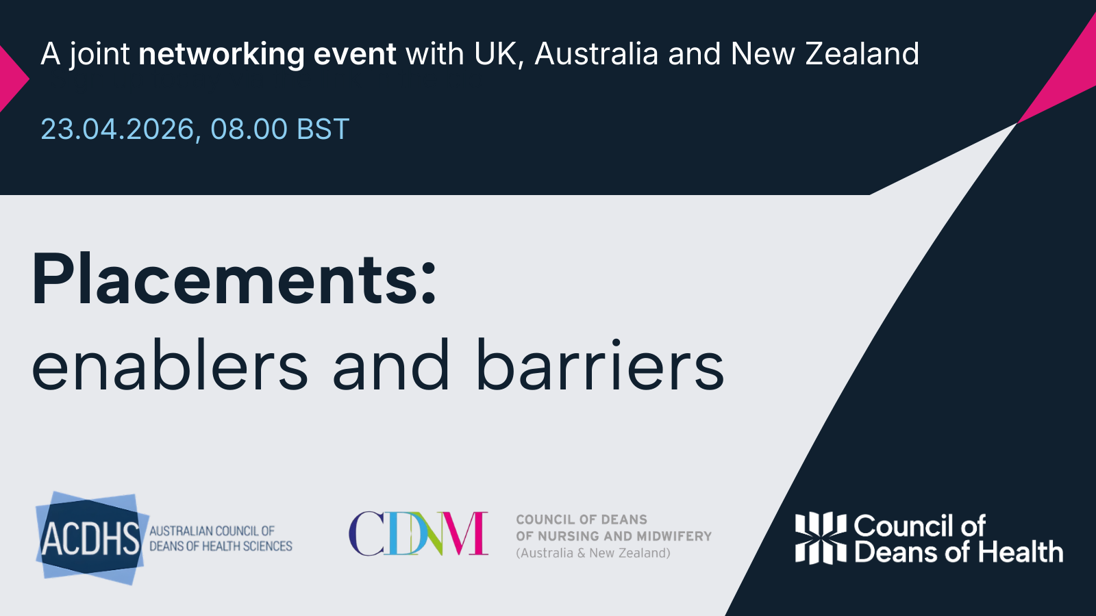 This joint online event, Placements: Barriers and Enablers, brings together members of the Council of Deans of Nursing and Midwifery, Australian Council of Deans…