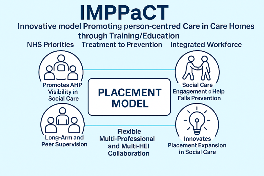 - Hospital to Community and Integrating Preventative Care: The model places AHP students in care home settings, shifting the focus of care and learning closer to where people live. It is centred on preventative interventions, such as falls prevention and nutrition.